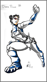Então que Allan Heinberg, em sua passagem pelo gibi da Mulher-Maravilha, trouxe de volta Diana Prince. Agora re-imaginada como uma agente do Departamento de Assuntos Meta-Humanos, esse era o visual idealizado por Terry Dodson para a identidade secreta da amazona.